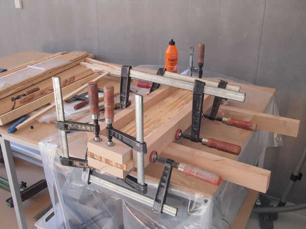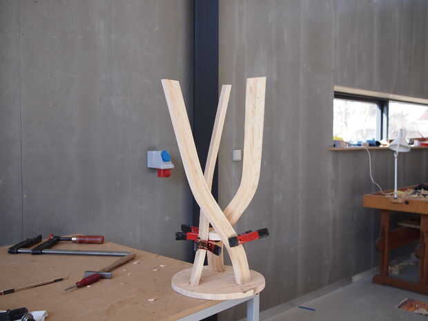 12) la plantilla de doblez será utilizado para pegar las piernas juntas. Asegúrese de que la madera esté completamente seca. Poner un plástico entre la tira de madera y la plantilla para asegurarse de que usted puede conseguir la pierna hacia fuera.