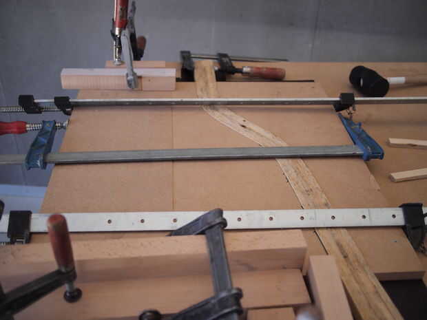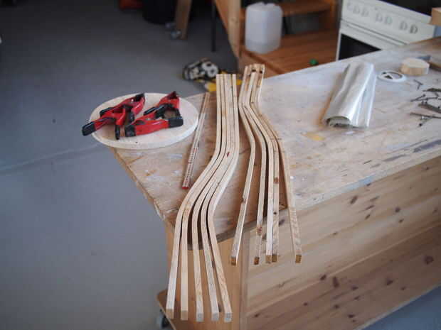 9) una vez que la plantilla de doblez es configuración, sacar cinco tiras de madera y doblarlas. Trabajar con rapidez, cuanto más tarde, más difícil resulta doblar la madera. Es mucho más fácil con un poco de ayuda, especialmente si tu plantilla no es sólida como una roca. También ser muy cuidadoso con la plantilla. Asegúrese de que la forma pedazos no pueden moverse fuera de su plano, con toda la tensión es poner sobre la madera, las pinzas pueden aparecer con mucha fuerza.