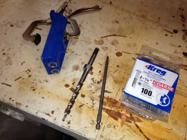 Un conjunto de plantilla de agujero de bolsillo (el mío es un Kreg que compré hace unos años. Incluye la abrazadera, broca y destornillador así como algunos tornillos. Todo en el momento por alrededor de $40.00)