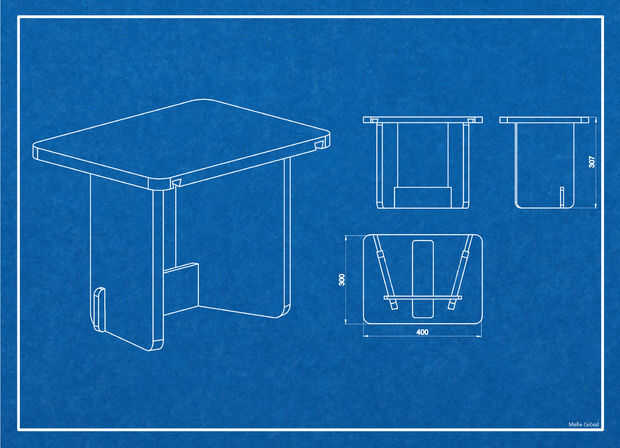 Las heces consisten de 4 partes principales: el asiento, 2 patas y una llave. 2 Introduzca playa fueron agregados cuando el taburete fue terminado para darle un aspecto más limpio. Las perillas se firmaron para ser utilizado en su configuración de flatpack, pero no hizo e instaladas porque parece ser frágil y había obstruido las miradas limpias.
