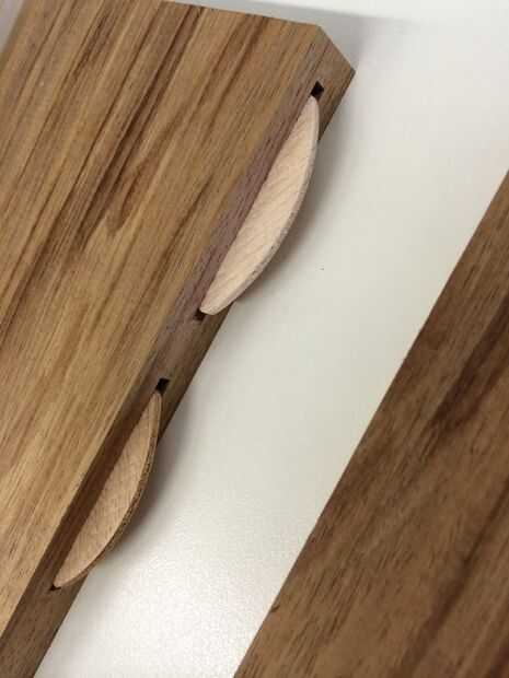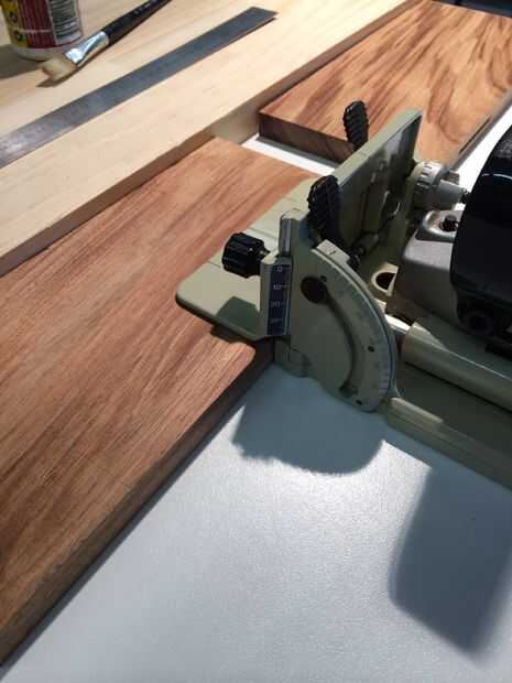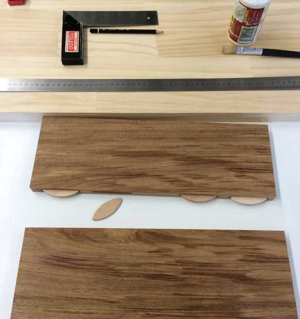 La madera vestida era cortada a la medida y en tablas más anchas. El asiento y las 2 piernas fueron hechas por ensambles de 2 duelas, con un par de galletas y pegamento PVA.
