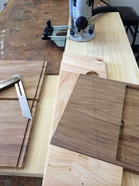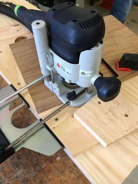 La parte inferior del asiento tiene unas difíciles piezas a cortar. Lo primero que hice fue de enrutamiento el bolsillo para almacenar la llave en el modo de flatpack. Para cortar las 2 correderas de cola de Milano en ángulo, tuve que fabricar una plantilla de madera para guiar la fresadora Festool.