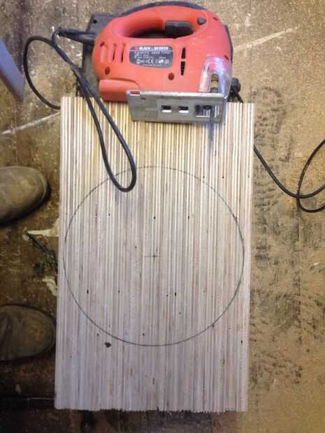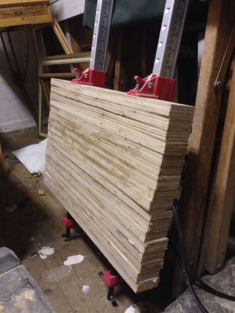 Cortar tiras de capas en 40mm y les pegan, afianzado con abrazadera y deja para secar. Una vez seco cepillada y lo lijada. A continuación medí el diámetro que quería, dejando 10mm cada lado de la parte superior de la pierna. Marcó y cortar con una sierra de calar.