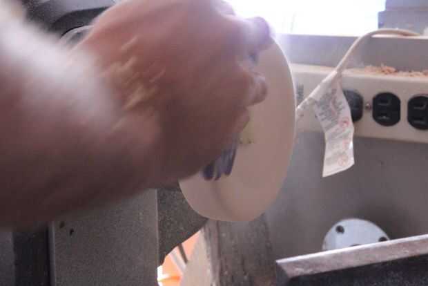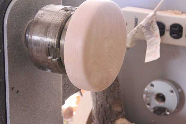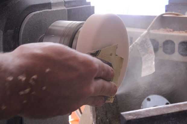 Montar otra vez el disco de maple en el mandril y acabado liso y arena los bordes y la cara. Lija de grano 80 a través de grano 800. Después de usé pulimento de fricción en el disco para terminarlo.