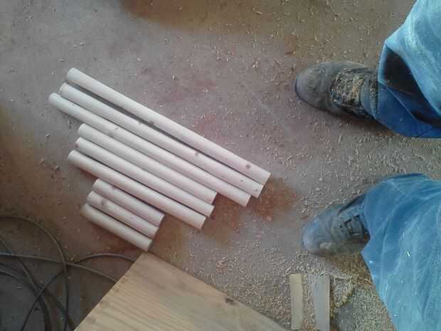 Quería que esto sea simple pero con un toque. hacer las patas redondas parecía ser. Hay 9 que son 1 1/2" de diámetro por 6 1/2", 1/2 de 14" y 22 1/2". 3 de cada uno. todos estos se realizaron con 2 X 4 rasgado por la mitad. Utilicé material de chatarra pero un montante de nuevo haría todas ellas además de la pierna en niveles. Si no tienes 1 X 4, pegue dos 2 X 4.