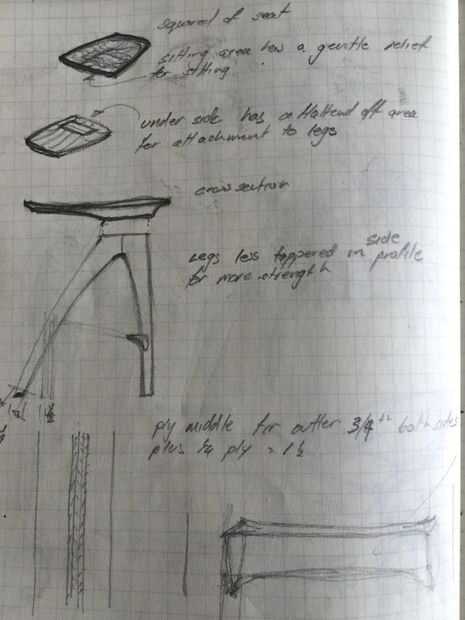 El proceso comenzó con los bocetos y el diseño elaborado a mano de las heces, que se convirtió en la base de plantillas para los desbastes, los perfiles principales. Mattie permitió el diseño a mover a través de diferentes iteraciones como abordar desafíos en torno a estabilidad como buscaba un perfil limpio que expresa un mínimo inteligente, orgánico de material para crear un banco fuerte.