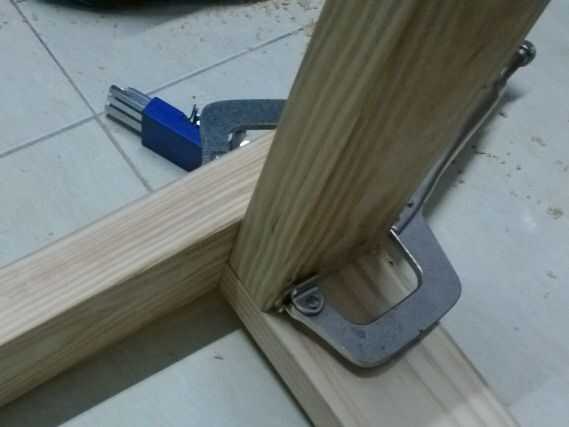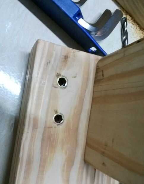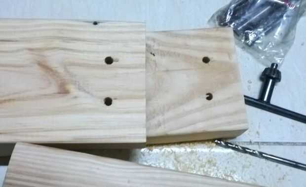 - Ahora conectamos las 2 mitades -Perfore agujeros en el otro travesaño -Alinear para perforar previamente los orificios para los insertos de madera -Introduzca los insertos roscados de madera