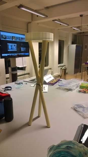 unas muletas de metal, un par de ruedas de bicicleta y tubos interiores, y unos tornillos junto con algun aislante y un pedazo de madera contrachapada y los ingredientes para un taburete. Un taburete de altura regulable.Mención de este proyecto deber