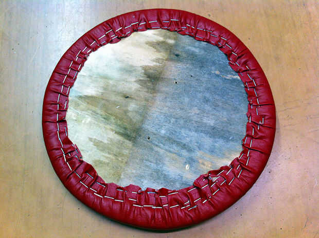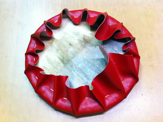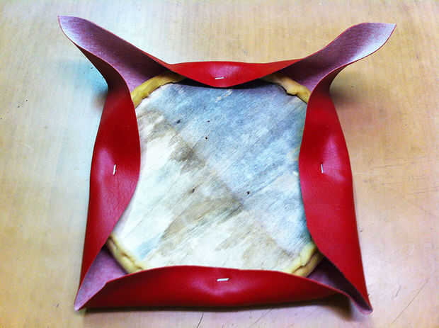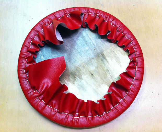 Al igual que hiciste con la espuma, tire el cuero un poco y empezar a grapar los puntos cardinales a la madera.