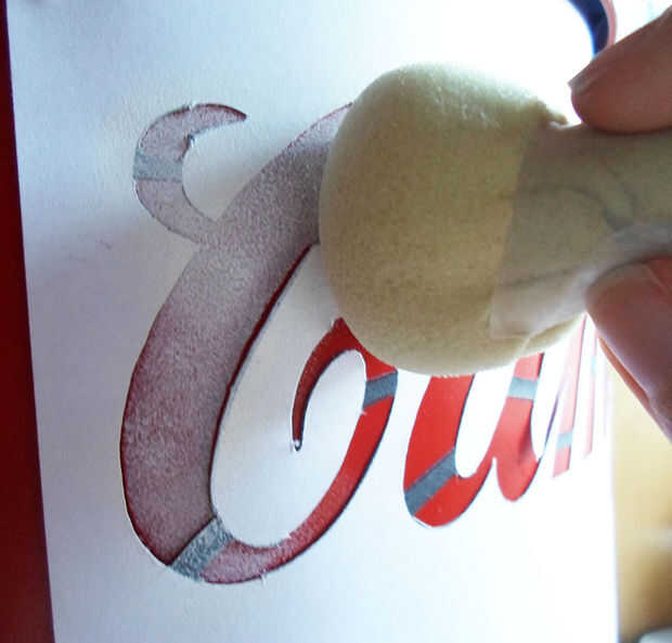 "Sucia" la parte superior de su espuma con alguna pintura acrílica blanco y empezar a dab en la plantilla.