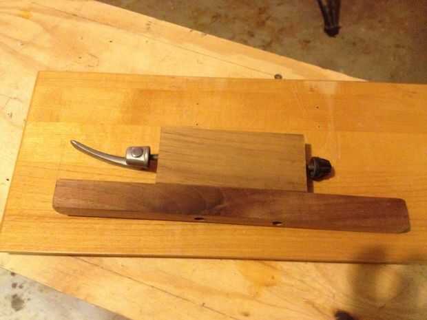 Un primer plano de la parte trasera, corte el para hacer la parte posterior del derailleur nivel.   Esto resultó para ser demasiado inestable - es necesario tener una base más amplia.  Así que construí una más amplia base ese ajuste donde el eje utilizado para vivir.   El soporte está construido de unos pedazos de madera (nogal).  Taladré un agujero a través de la chatarra que se ajusta entre el triángulo trasero e inserta un pincho viejo de liberación rápida para celebrar todos juntos.