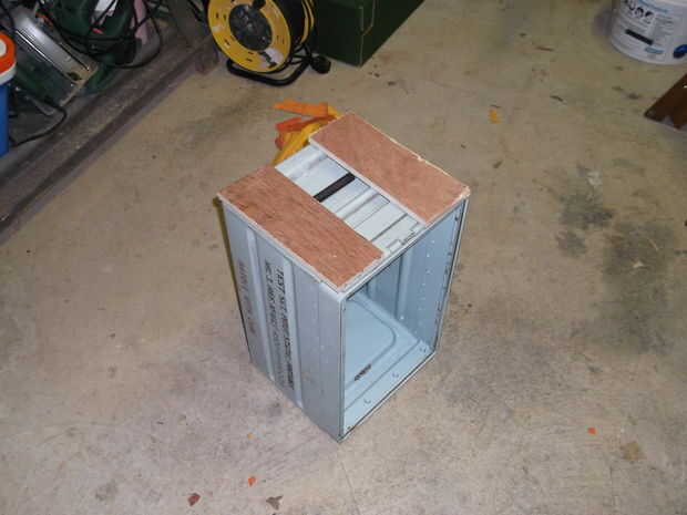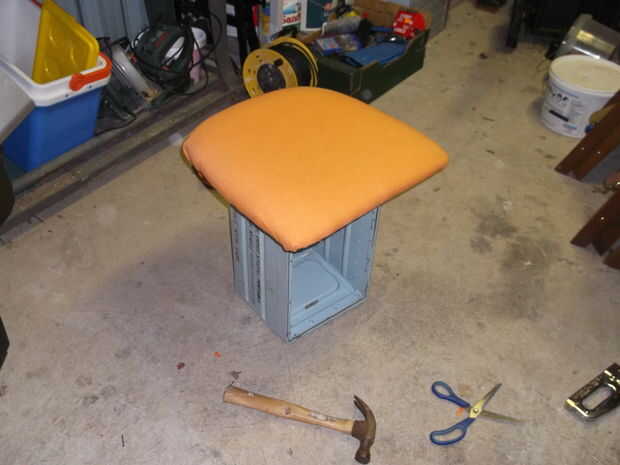 El cuadro es la cáscara de una caja de prueba pitot-estático de aviación vieja, inservible, en el Reino Unido. Es cerca de 18 pulgadas de largo, un pie de alto y 10 pulgadas de cuadrado y de acero... Es la base del asiento de una silla de la cocina y la cubierta es una vieja manta de línea aérea. Hay dos listones de contrachapado marino de chatarra, para pasar por debajo de la base del asiento. Para construir, necesita una engrapadora y grapas de media pulgada y un tubo de TEC-7 o equivalentes y alguna cinta de la tela... Corte un gran suficiente pedazo de la vieja manta con sobre una superposición de dos pulgadas y había grapada a la base del asiento, manteniendo apretado cuando fui. También se aplica alguna cinta de tela para poner en orden el borde de la cubierta de tela, más apariencia que otra cosa. Luego pegué los dos listones a la parte superior de la caja. Aquí hice el error de no recortar a la tela negra en la parte inferior del asiento para permitir una combinación clara de la madera base de asiento y los listones. Otra vez, usé TEC-7 para unirse a ellos. El resultado es un asiento simple y robusto que añade un poco de color al taller.