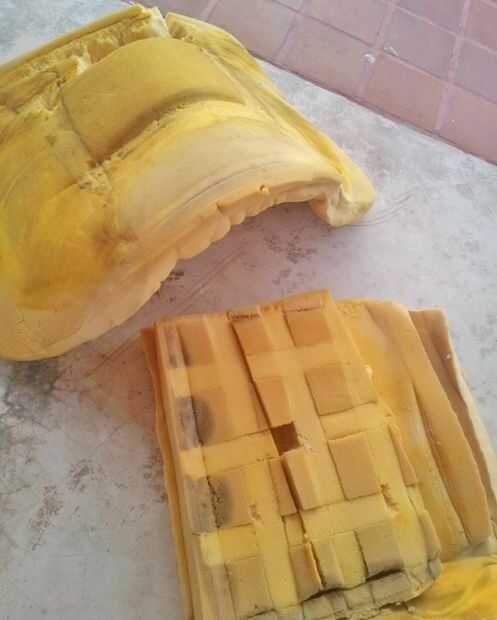 esponja de 2". La mía es reciclado. Había salvado mientras que mi madre era volver a amortiguación! (sí, estoy un poco de una rata del paquete)