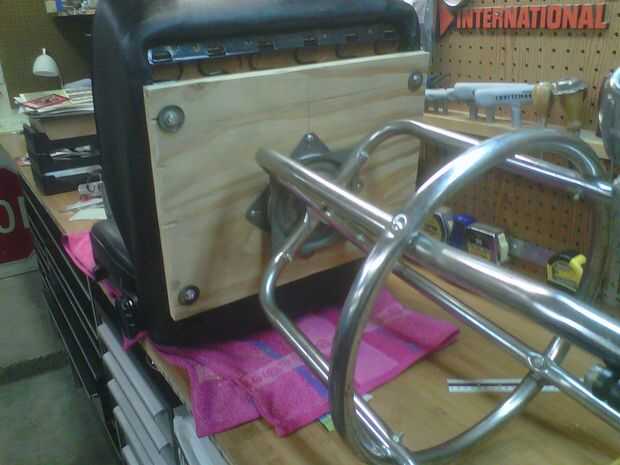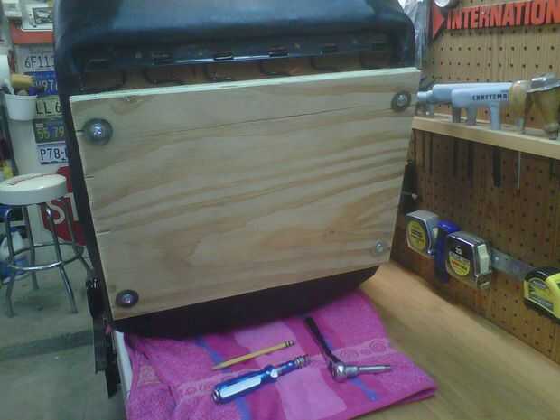 Que miden los agujeros en la parte inferior del asiento y la madera contrachapada base 1" más grande (los agujeros eran 16" de ancho por 13" de profundidad por lo que la madera es 18" de ancho por 15" profunda). Quería asegurarse de que sería fuerte. Yo los agujeros perforados y montar primero la base para el asiento. Luego usé la tapa original del taburete como guía para diseñar la mejor colocación de mis agujeros en la base. He intentado calcular el nuevo centro de gravedad. Utilicé el método WAG (conjetura de asno salvaje). En la foto verá que pongo la tapa del taburete hasta la parte trasera de la canastilla de coche. Tengo suerte en el primer intento y funcionó muy bien.