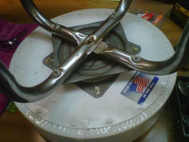 Transferí el patrón de pernos del Taburete giratorio a la base. Después de la perforación pruebe la colocación de todo. He usado los tornillos originales de la parte superior del OEM de las heces. Puedo lamentarlo más adelante, pero parece robusto por ahora.
