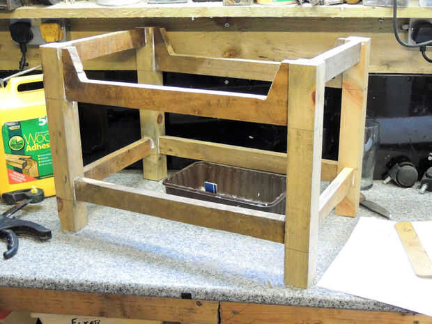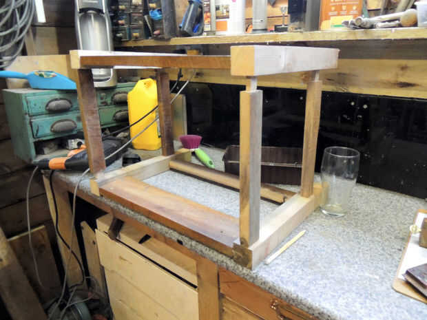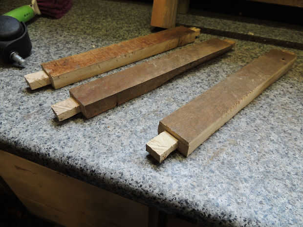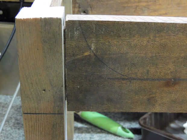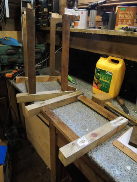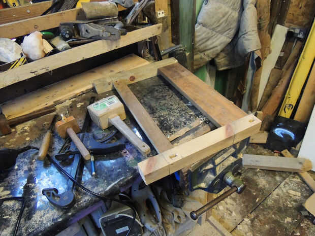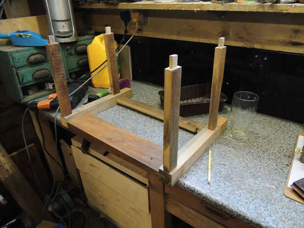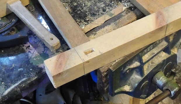 Las espigas eran mano cortar en la forma tradicional. El mortices se cortan usando una ruta eléctrica - mucho más rápida. Ellos fueron entonces enfrentaron utilizando cinceles de mortaja. Los rieles largos caras se realizaron en primer lugar, luego se cortan mortices para el lado corto con los carriles largos en lugar.