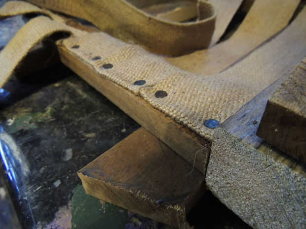 Porque la estructura de madera fue hecha por articulación piernas (montantes) y rieles (horizonal struts), no tenía soporte en sí mismo, para la parte superior acolchada que descansaría sobre it, y correas tan necesitaba.