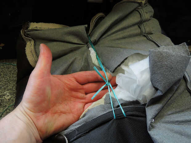 La parte superior fue hecha apenas cortando uno de los cojines del sofá y remodelación con cadena tenssioning debajo (literalmente, verde jardín cadena).