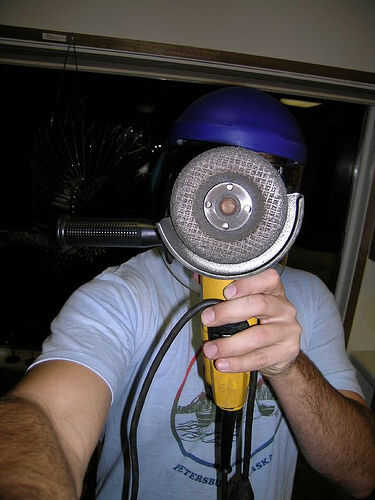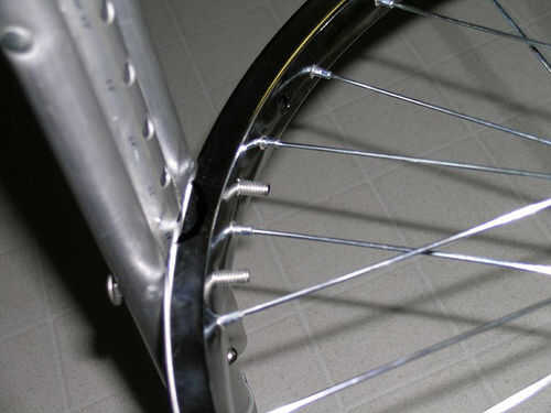 Después de un poco de prueba y error encontré que es importante a la muesca una sección de por lo menos la brida superior del borde inferior para permitir la muleta para ajuste de altura mientras las piernas se emperna en forma segura. Perforé a través de cualquiera de los lados de la porción de pierna ajustable y la parte correspondiente de la llanta. Luego deslizando algunos de transporte pernos en podrían marcar las secciones de la llanta que necesita ser arreglado hacia atrás. Solía el marcador para también ennegrecer el extremo del perno que era el más cercano al vástago de la válvula abertura de la llanta. Que tuve que jugar con el borde y las piernas tratando de que los pernos a través de los agujeros desalineados. Corte las áreas de la sección central de la pierna. Esto se puede hacer con una sierra para metales y cierta frustración o puede utilizar una amoladora. Hacer una incisión más pequeña en la parte inferior brida de la llanta no es mala idea - apriete el borde y las piernas juntos demasiado el borde podría presionar en la pierna de la muleta y restringir el ajuste de la altura.