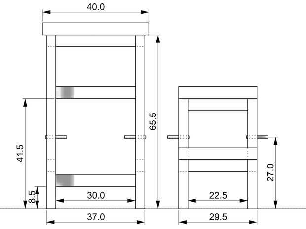 Una nota sobre las dimensiones, todos los tableros de madera son 4,5 cm de espesor y todas las vigas tienen sección de 3.5 x 4.5 cm, eliminado con más inercia en la dirección del lado más corto de la banca, así que para ahorrar más espacio para las medidas interiores.