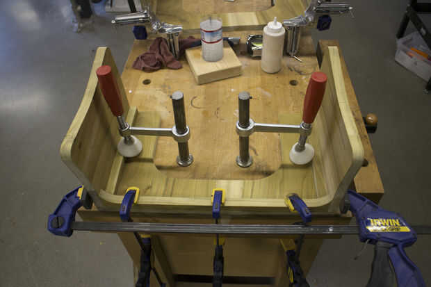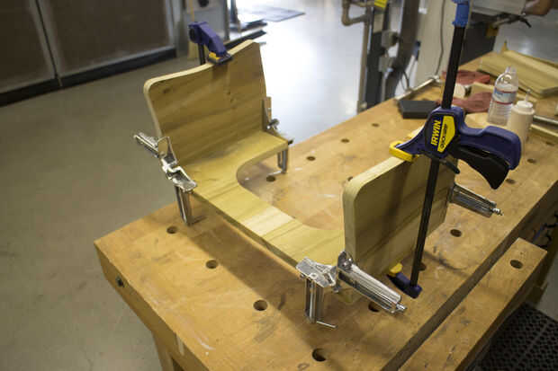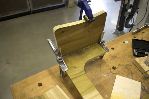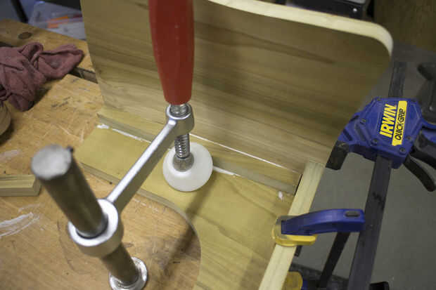 En primer lugar, sujeta las piernas en el tablero de pie. Las abrazaderas de esquina son grandes para asegurar que usted consigue constante perpendicular, y añadí una pinza de presión en el centro para asegurarse de que hubo un contacto sólido entre las superficies.