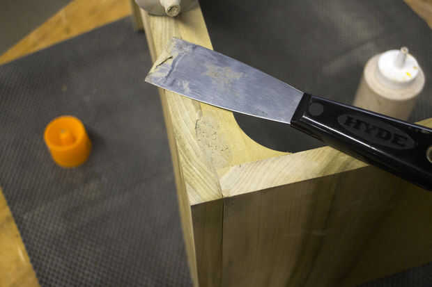 Una vez que el pegamento se curó, llené en el puñado de grietas con masilla para madera puede manchar. Una vez que cure, lija toda la pieza hasta grano 220. Esta izquierda una suave superficie es fácil de no limpiar asperezas o astillas para haceros con el paño de limpieza.