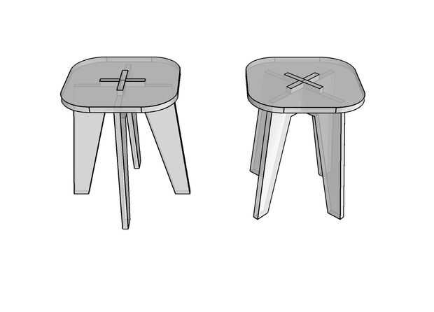 me dieron unas hojas de 90 x 180 cm (3 x 6') de madera ligeramente usado que estoy en el proceso de reasignación.Desde que tengo uso de un par de sillas extras de vez en cuando, recientemente saqué este taburete ranurado (paquete plano) en Sketchup.H
