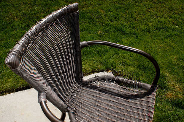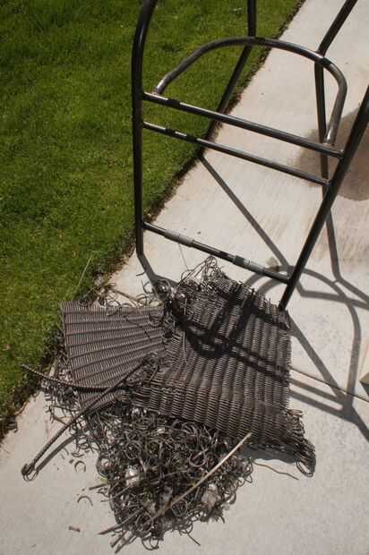 Se puede ver cómo el plástico había agrietado y split. Corte el mimbre plástico de los marcos de taburete de bar con una navaja; teniendo cuidado de no rayar el recubrimiento de polvo.
