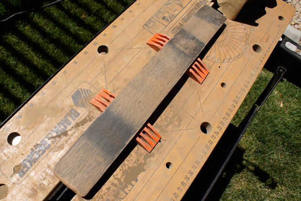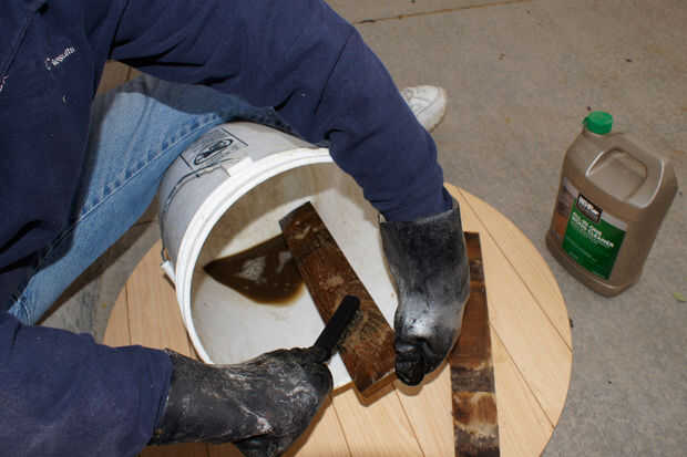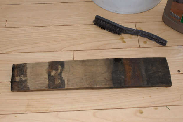 usé un cepillo de cerdas de plástico grueso para trabajar madera blanqueador en cada pentagrama. El principal componente de la lejía madera es ácido oxálico; comúnmente utilizado para eliminar las manchas y el desgaste de cubiertas de madera al aire libre. ¡ ADVERTENCIA! Este químico también es ácido! Siga las instrucciones en el envase! Use guantes de goma fuertes, de manga larga, protección para los ojos así como una careta para evitar quemaduras! Después de dejar el trabajo de bleach unos 30 minutos, enjuagar la superficie con agua y dejar secar. La lejía quita la mayor parte del color gris degradado, pero apenas tocó las manchas negras dejadas por los aros de acero. Puede eliminar este paso dependiendo de cómo desea que la superficie acabada para ver. Sólo podría lijar hasta la madera pelada. O si quieres mantener la pátina, ligeramente la superficie de la arena y después de quitar la carbonización, aplicarán un poliuretano exterior (spar).