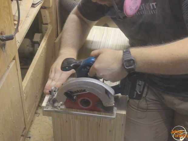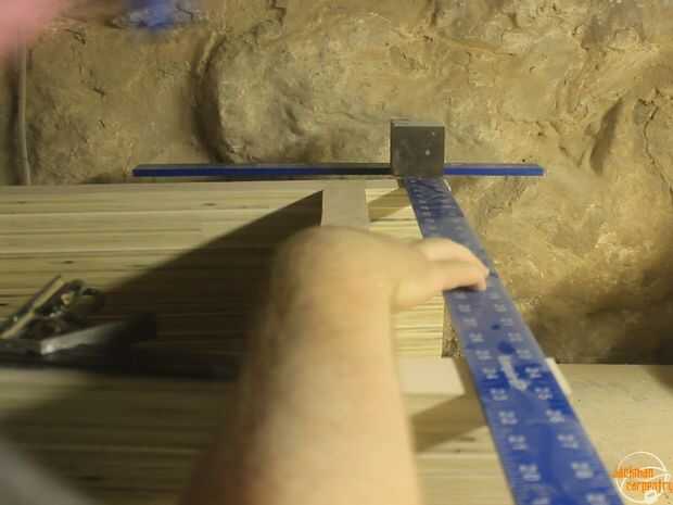Utiliza un cuadrado para dibujar una línea recta a través de las dos piernas paralelas a la "plataforma" - determina la parte inferior de las piernas. Cuadrado a lo ancho y cortar a la longitud con una sierra circular.