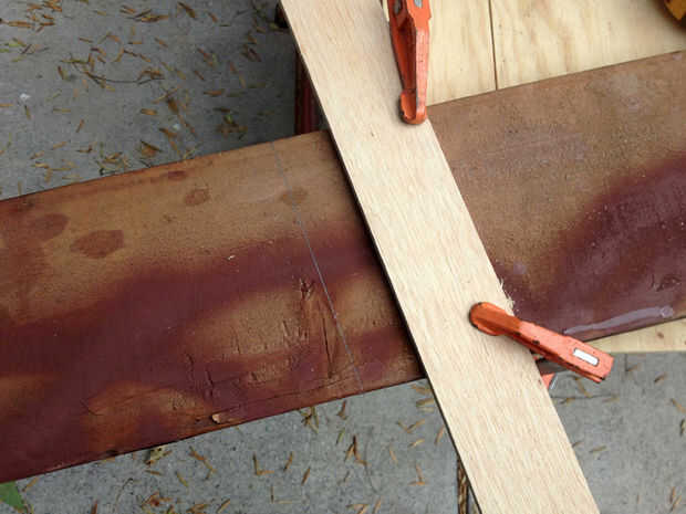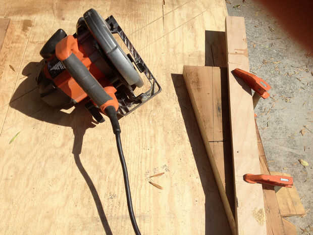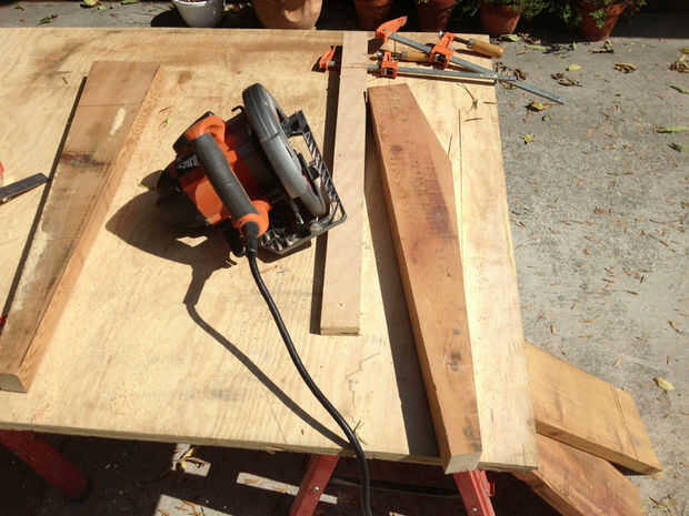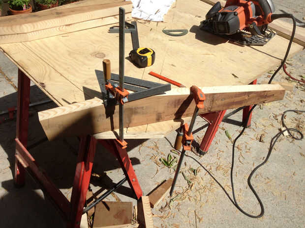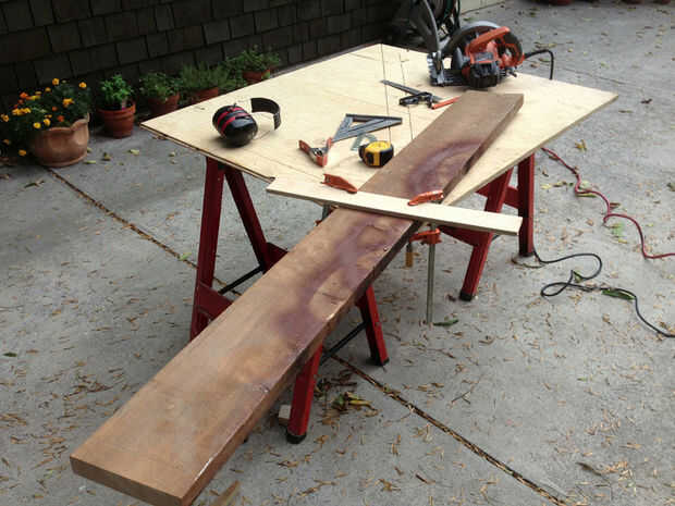 Comienzan las patas cortando dos espacios en blanco de 2 x 8 en 29", inglete en paralelo en 10 grados. Falta una chuleta de sierra, lo hice con una sierra circular y un transportador. Sujeta una pieza de contrachapado de chatarra 1-7/16" de la línea de corte (medir la placa base de la propia Sierra de precisión aquí), contra él corrió la placa base de la sierra para un corte recto. Mientras que un poco más lento, es una solución precisa cuando hayan limitado herramientas.