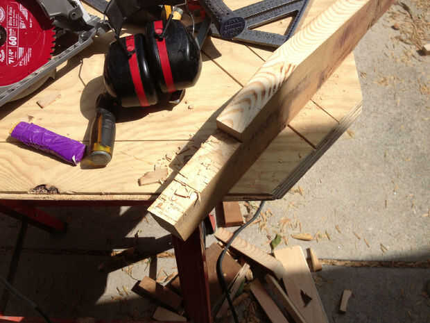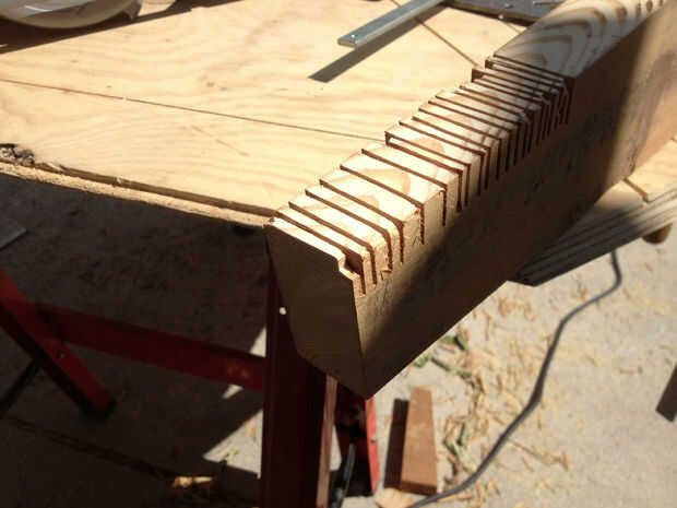 Ajuste la profundidad de la sierra a 3/4". Hacer una serie de cortes paralelos sobre el borde cortado del 10", como se muestra en las fotos y eliminar los residuos con un martillo. Limpiar las ranuras con un cincel.