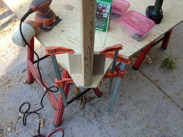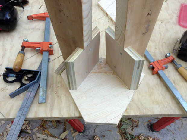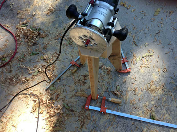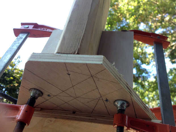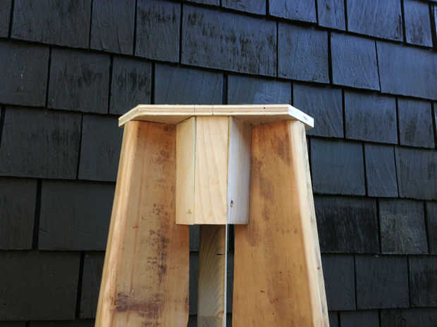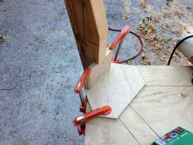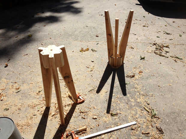 Coloque una abrazadera a cada pata del taburete, como se muestra para evitar oscilación alrededor durante el aserrado. Puede estar parado en las abrazaderas para la estabilidad adicional. Utilice una broca de recorte al ras y un router para recorte la madera sobrante en la placa superior, terminando con una tapa en forma de estrella. En este punto, se suman un resto del pie 10" de la base de las patas si quieres; lo ayuda a entrar y salir de las heces, aunque no es estructuralmente necesario. Hice mío con unos trozos de madera contrachapada. También sería agradable una pipa, pasador o pedazo de tubo galvanizado.