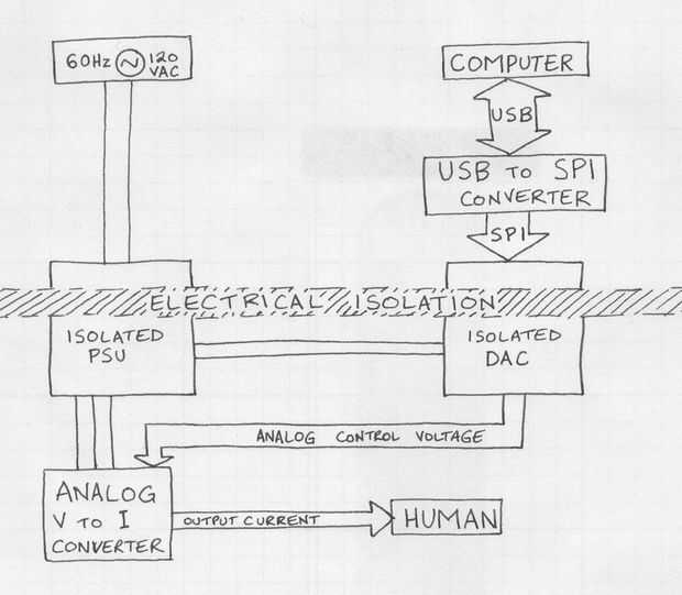 Como se puede ver en el diagrama de bloques anterior, origina la señal de control para el dispositivo en una computadora que está conectada a un convertidor de USB a SPI. El convertidor envía una señal SPI a un DAC aislada, que convierte la señal en un voltaje analógico. Este voltaje analógico va a un voltaje al convertidor de corriente, que suministra una corriente regulada a la humana. La fuente de alimentación alimenta todos los circuitos detrás de la barrera de aislamiento. Echemos un vistazo a cada subsistema con más detalle, de la espalda humana.