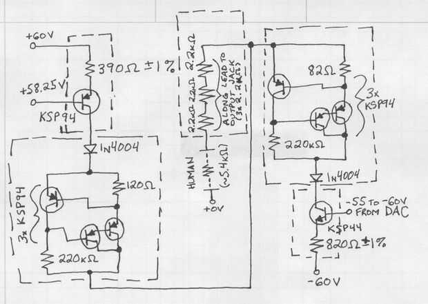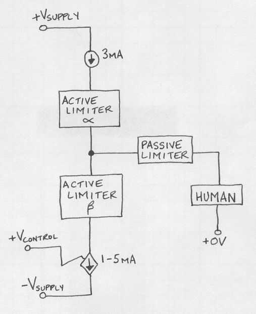 Un diagrama de bloques se ha proporcionado con la esperanza de aclarar lo siguiente, el principio de funcionamiento de la tensión al convertidor actual: cuando la fuente variable de corriente 1mA, sólo se necesita 1/3 de la corriente suministrada por la fuente de 3mA y la corriente resultante a través de los humanos es + 2mA (3mA-1mA), y cuando la fuente de corriente variable a 5mA , lleva 5/3 de la corriente suministrada por la fuente de 3mA y la corriente resultante a través de los humanos es - 2mA (5mA-3mA). Barriendo la variable fuente actual de 1mA a 5mA proporcionalmente arrastra la corriente a través de los humanos de + 2mA a - 2mA. Los limitadores activos nunca se activan durante el funcionamiento normal, y el limitador pasivo no gotas más de 14V a menos que ocurra una falla.
