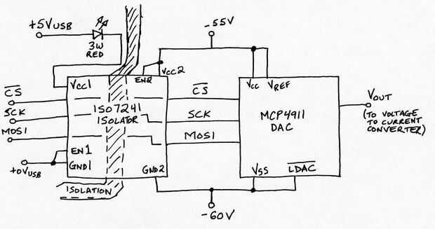 El LED rojo sirve para soltar los 5V del puerto USB a unos 3, 3V, que es el nivel de señal de salida de nuestro USB al convertidor del SPI. El ISO7241 puede funcionar de 3,3 v o 5 v a ambos lados, pero la tensión de alimentación debe ser el mismo que el nivel de señal de entrada. El DAC aislado también tiene un 0.1uF condensador de cerámica entre cada uno de los insumos de alimentación positiva de los chips y la tierra, omitido en el esquema que se muestra arriba.