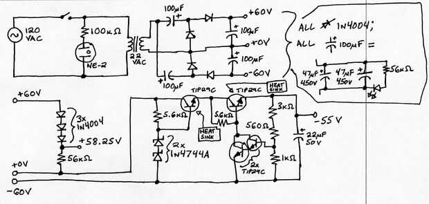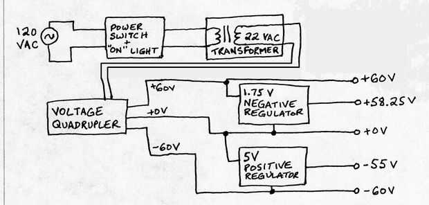 Primer trabajo importante de la fuente de alimentación aislada es aislar eléctricamente los circuitos de salida de la alimentación. Esto se hace por el transformador. La fuente de alimentación produce + 60V, + 0V y - 60V de la 22VAC del transformador con un circuito de voltaje quadrupler (descrito con más detalle en el siguiente paso). El + 58.25V y - 55V carriles se derivan de la + 60V - 60V rieles y con reguladores lineales.