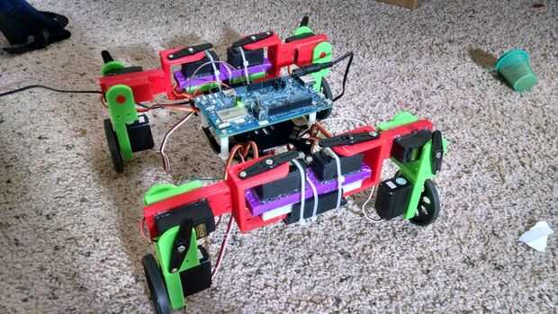 Esta es mi interpretación de Tachikoma rudimentaria utilizando un Edison de Intel como el controlador principal y un montón de servos (montón = 12). Mi objetivo principal era crear un robot que puede caminar así como rollo basado en lo que la situación exigía. Para reducir el número de servos, debido al peso y costo, las piernas son 2DOF con un servo de rotación continua en la parte inferior para movimiento sobre ruedas. Decidí usar un servo en vez de una causa motor DC que no necesita circuitos de impulsión adicional y un motor de DC con todos los engranajes y requisitos de energía sólo añadir el peso de la pierna, lo que hace imposible levantar.