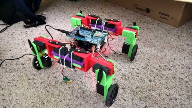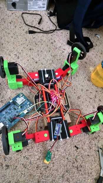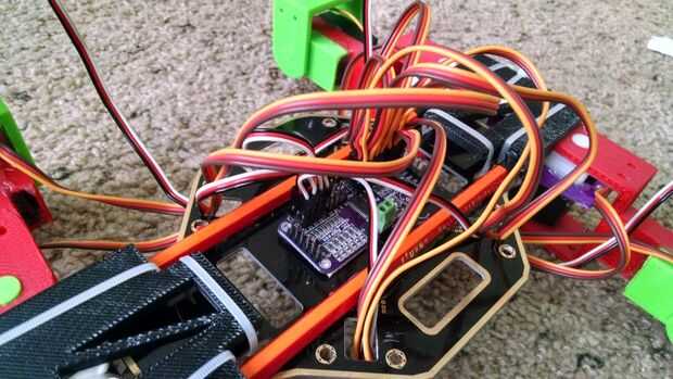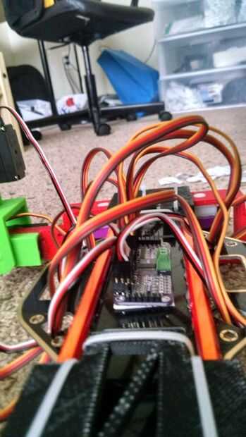 Los servos necesitan conectarse al controlador I2C, que se une a la parte inferior de la base a todos. Cada pata tiene tres servos, dos para el movimiento de las piernas y uno para el movimiento de balanceo. He decidido agrupar las clavijas por las patas y las ruedas. "Cadera" conectar los servos son todos primero seguido de la rodilla "servos". Los cables pasan por los agujeros rectangulares en la placa base y están entonces conectados al conductor, de modo que se agrupan según la pierna y ayuda a poner en orden los cables un poco. No quería hacerlos demasiado apretado como luego restringiría el movimiento de las piernas. Últimos son conectar los servos de la rueda. Para una ordenación apropiada de pernos, el código debe ayudar. La numeración dada a los pins de servo coincide con su orden de las conexiones. Los servos se pueden conectar en cualquier orden pero agrupándolas ayuda a hacerlos más fáciles de manipular en el código.
