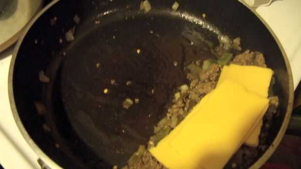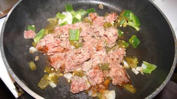 agregar la carne molida y cebolla restante y pimientos a la sartén caliente y cocinar hasta que la carne es de color marrón, elimine grasa y empuje hacia el lado de la cacerola