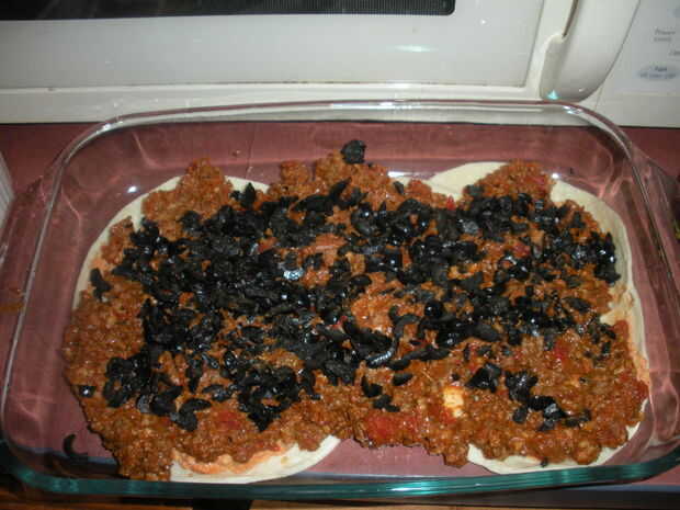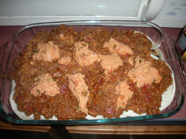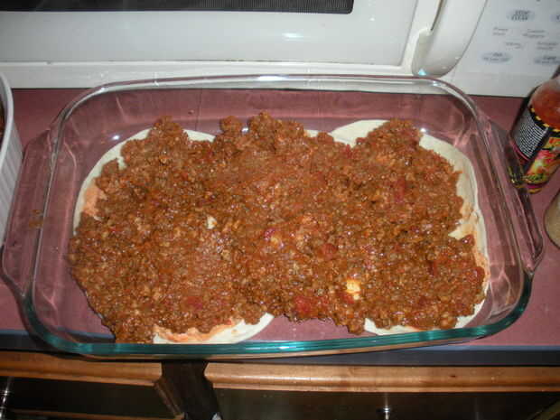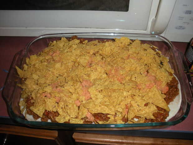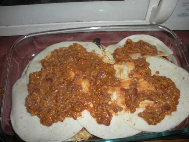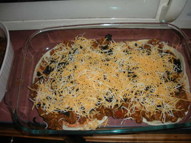 I microwaved las tortillas suaves de 40 segundos, puso varias en el fondo de un molde para hornear y manchada con el DIP de queso, luego agregué una capa de la mezcla de carne y que coronada con aceitunas negras picadas y rallado mezcla queso de taco. Luego añadí otra capa de tortilla, manchada que la capa con el puré de frijoles y más de la mezcla de carne, luego parar en el resto del dip de queso y aplastados unos puñados de la viruta de la tortilla con sabor a Rancho de una bolsa azul y finalmente lo rematado con más queso rallado y preparadas en un horno de 325 durante 45 minutos hasta que la parte superior se dore muy bien