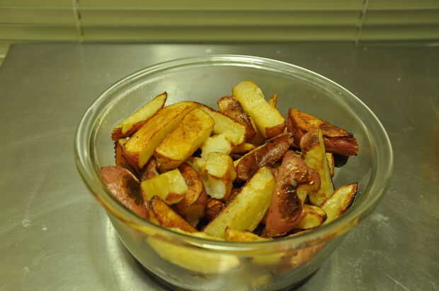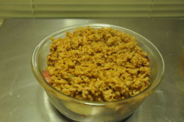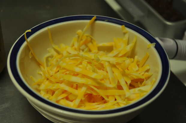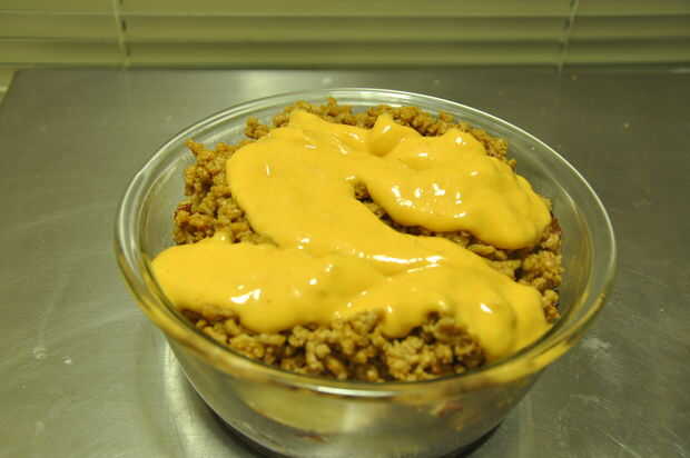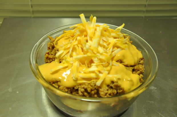 Tomar su tazón de fuente, o placas, de papas fritas y añadir la carne, luego la salsa de queso y cubra con queso rallado. También hemos añadido un poco de salsa por encima.