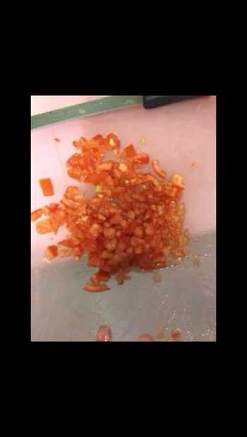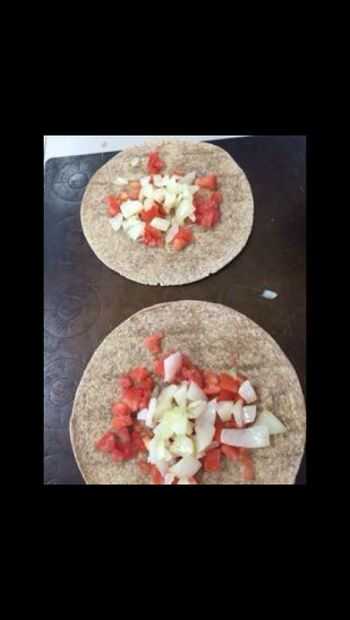 Paso 6: Luego, cortar en cuadritos el tomate y la cebolla y ponerlos encima de las cáscaras de la tortilla