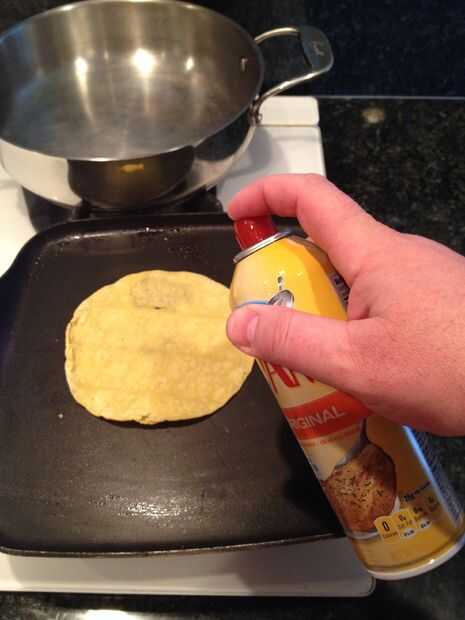 Consejo: ambos lados de la tortilla necesitan ser rociado con spray antiadherente. Después le da la vuelta, usted puede rociar un poco en la parte superior.
