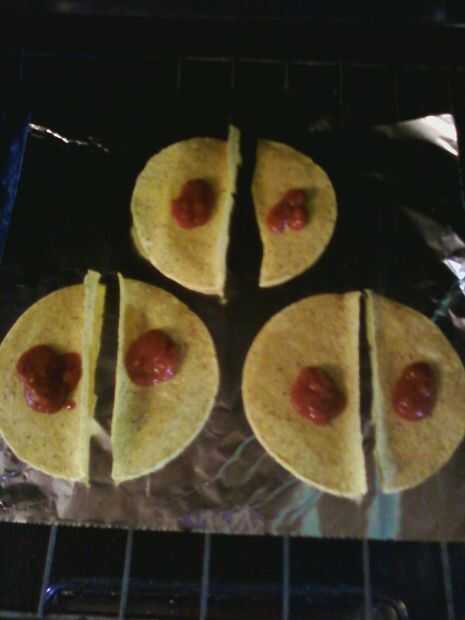 Coloque aproximadamente 3/4 de cucharadita de salsa de tomate sobre cada taco medio. Cada taco y taco marca son diferente, así que tendrás que experimentar un poco. Tenga en mente, usted siempre puede añadir salsa de tomate si te encuentras tienen demasiado poco, pero es mucho más difícil deshacerse de él, una vez que está en.
