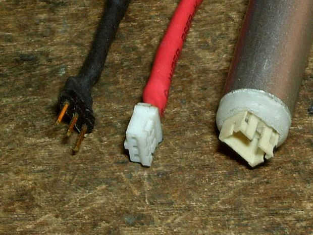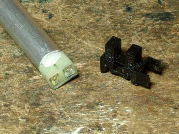 La carcasa de plástico blanco es parte de un conector de alimentación de ordenador. El par emisor/detector es montado dentro de la vivienda y en un tubo de aluminio.
