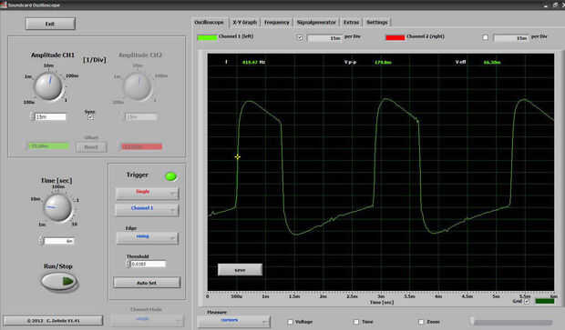 Mi agradecimiento a Christian Zeitnitz para ofrecer su osciloscopio de la tarjeta de sonido gratis. Este es el alcance mejor (y más fácil) nunca he usado. Los controles y funciones son similares a un ámbito superior de banco estándar.