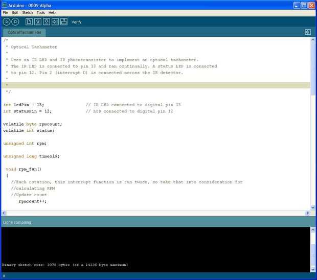 La función de bucle, como su nombre indica, es el bucle de procesamiento principal que "para siempre" mientras que el tablero se enciende. Los primeros retrasos de declaración durante un segundo (1000 milisegundos), pero tenga en cuenta que la función de interrupción se rompen en cada vez que el valor del pin 2 cambios y ejecuta la función rpm_fun. Retardo de 1 segundo, la interrupción está temporalmente desactivado (esto puede no ser necesario, pero parece más seguro) entonces el número de revoluciones se calcula basándose en el número de interrupciones y el tiempo transcurrido entre hoy y la última vez ocurrió el cálculo. El resultado se envía a la computadora por el puerto serie, entonces la interrupción se restaura.