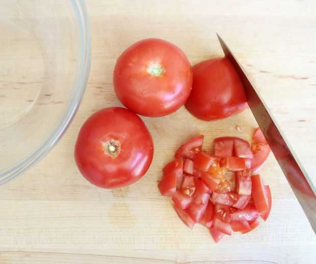 Picar los tomates y añadir a su tazón tamaño mediano.