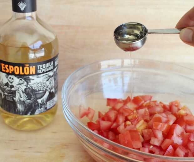 Salpicar las 3 cucharadas de tequila sobre ellos y revuelva. Deje reposar por 10 minutos antes de añadir el resto de los ingredientes.